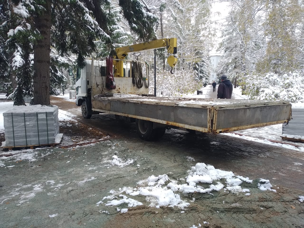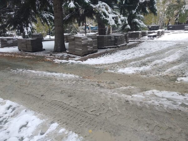 Читатель «Прецедента» Елена П. прислала в редакцию фото уже проделанных работ: старую плитку демонтировали, оставив на дорожках песок, уже припорошенный снегом. Вдоль тротуаров лежат упаковки новой плитки, к укладке которой еще не приступали.