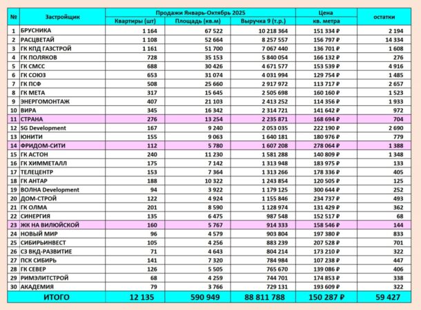 Авторитетный аналитик рынка недвижимости Сергей Николаев составил ТОП-30 застройщиков по объемам продаж жилья в новостройках в новосибирской агломерации за первые десять месяцев 2025 года. Эксперт опубликовал рейтинг в своем telegram-канале.