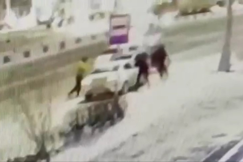 Несколько человек вышли из отечественного авто и вместе с доставщиками стали избивать водителя и пассажира белой легковушки.
