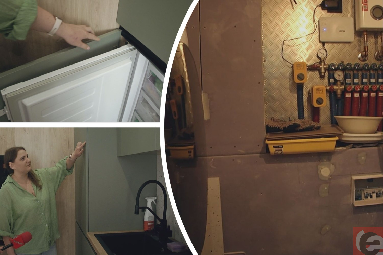 — Вот этого зазора между декоративной панелью и дверцей встроенного холодильника быть не должно. На посудомойке тоже перекрутили болты и они проступили на фасаде. Плюс не хватает нижнего цоколя, который ножки прикрывает, привезти его и установить отказались, — перечисляет дефекты Юлия Подводйская.