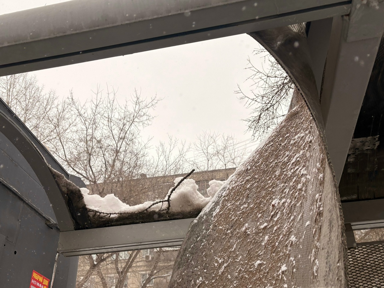 Инцидент произошел утром в районе дома, по адресу Красный проспект, 90. Кровля остановки не выдержала тяжести снега с наледью и рухнула.