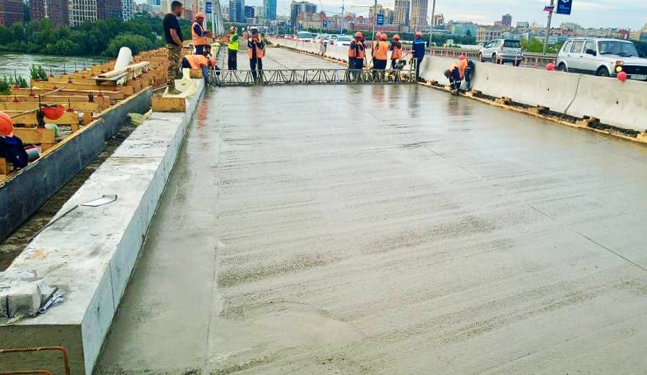 Одновременно с укладкой выравнивающего слоя специалисты демонтируют старые ограждения, обустраивают основание для установки новых перил, монтируют опалубку для дальнейшего бетонирования. Все работы ведутся под контролем инженеров «Гормоста».