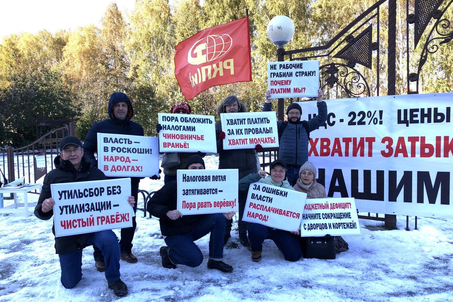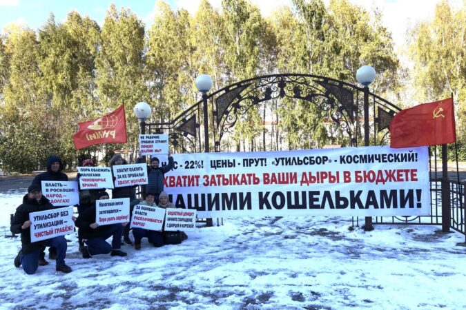 11 октября на алее напротив дома на улице Петухова, 76 в Кировском районе Новосибирска прошел пикет против повышения НДС и утилизационного сбора. Фотографию с акции опубликовали в группе «РКП(и)» в соцсети ВКонтакте.