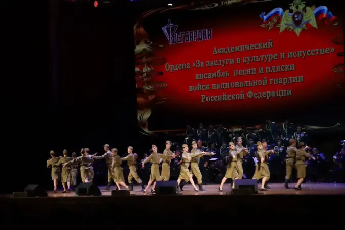 Зрители встречали стоя артистов Академического ансамбля песни и пляски Росгвардии, выступивших в государственном концертном зале им. Каца в Новосибирске.