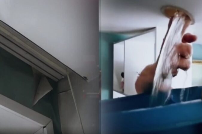 Люди сливают воду из натяжных потолков, собирают со стен и полов после каждого дождя.