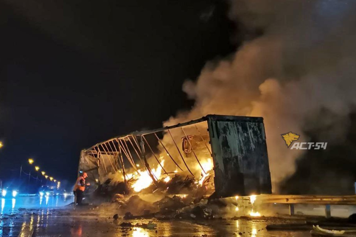 Объятый пламенем большегруз сумели запечатлеть на видео подписчики telegram-канала АСТ-54 Black. Возгорание случилось на автомобильной трассе Р-254 недалеко от станции Лесная поляна. Водителя фуры увезли на скорой. Сообщается, что он получил ушибы и ожоги.