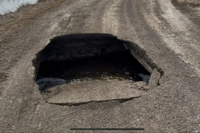Из-за паводка дорожное полотно провалилось — в середине зияет яма. Произошел размыв водопропускной трубы из блоков.