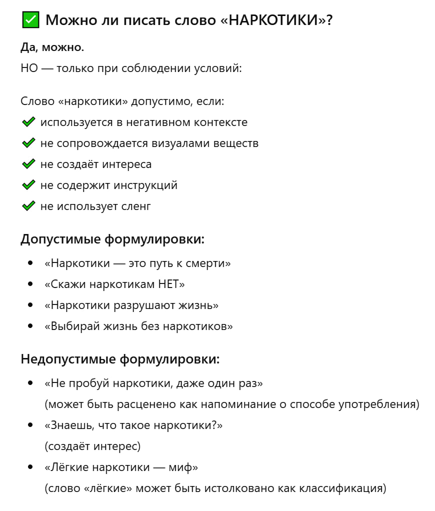 — Если на баннере моделируется ситуация «предложения», задается вопрос про наркотики, создается ощущение «варианта выбора» без жёсткого отрицания, то проверяющий может сослаться на ст. 46 ФЗ №3-ФЗ и ст.6.13 КоАП РФ (ответственность за пропаганду), — ответил ИИ на волнующий сибирячку вопрос.