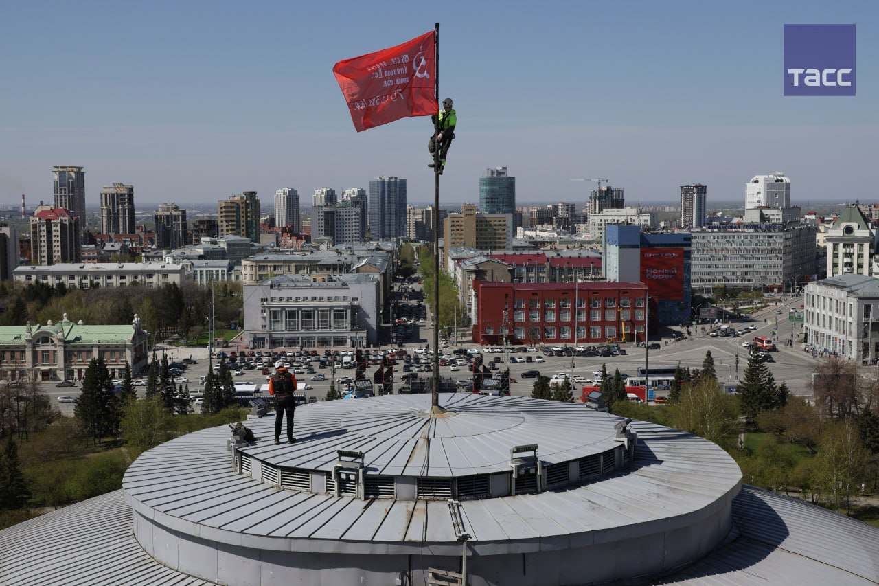 Промышленные альпинисты поднялись на купол оперного театра и водрузили Знамя Победы. Кадры разместила в своем телеграм-канале мэрия Новосибирска.