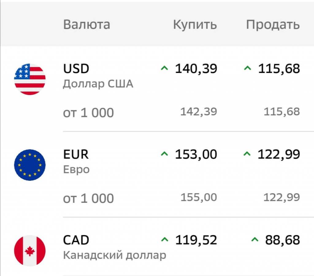 Так, «Сбербанк» на момент написания материала предлагал приобрести доллар за 140, 39 рубля. Продать валюту банку можно за 115, 68 рубля. Купить евро «Сбер» предлагает за 153 рубля, а продать – за 122, 99 рубля. При этом отмечается, что стоимость валют увеличивается в случае, если клиент захочет разом приобрести более 1 000 единиц за раз.