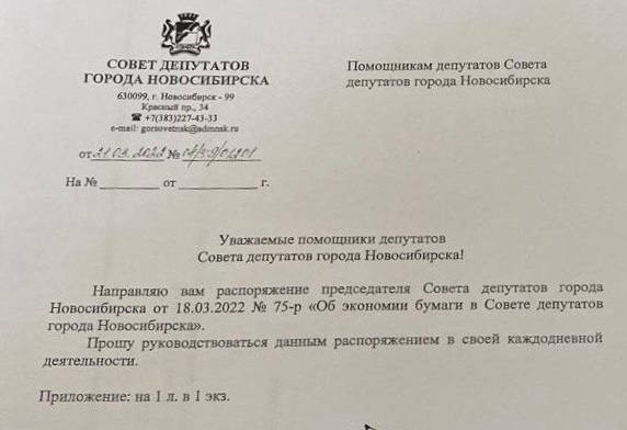 — Уважаемые помощники депутатов Совета депутатов города Новосибирска. Направляю вам распоряжение председателя Совета депутатов города Новосибирска от 18.03.2022 «Об экономии бумаги в Совете депутатов города Новосибирска». Прошу руководствоваться данным распоряжением в своей каждодневной деятельности, — говорится в документе.