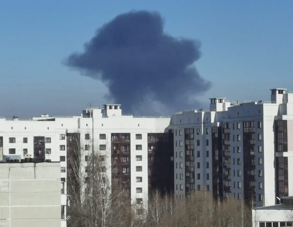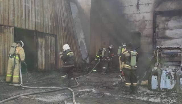 В ведомстве отметили, что пламя распространяется на соседний склад. Площадь возгорания составила 2225 квадратных метров. В настоящее время проводится усиление группировки пожарных, которые участвуют в ликвидации возгорания.