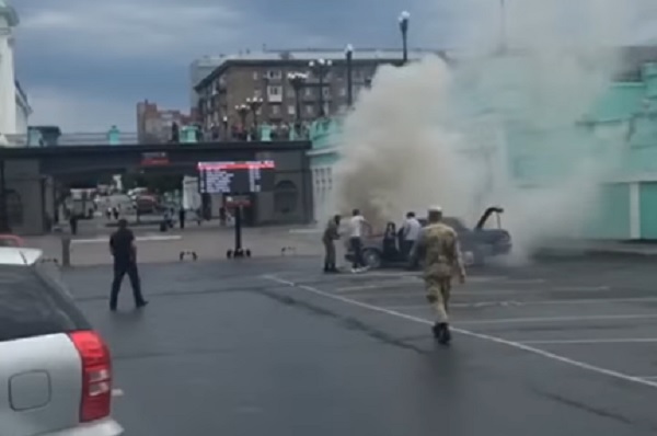 В Новосибирске на парковке у железнодорожного вокзала загорелся автомобиль. Пожарные прибыли на место через четыре минуты.