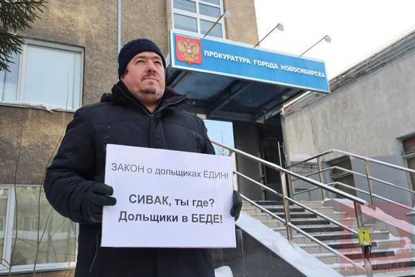 На фото: дольщик дома Бульвар Молодежи, 40 Александр Рудин в пикете