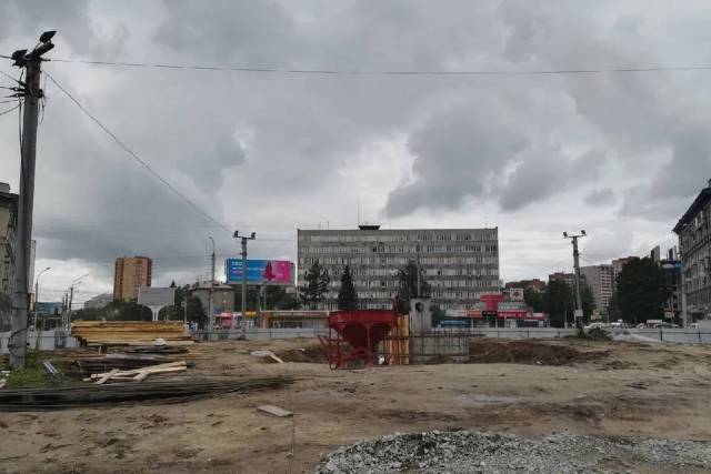 На фотографиях отчетливо видно, что посреди транспортного кольца уже возвышается фундамент. Впоследствии на него водрузят стелу «Город трудовой доблести» — памятник в виде четырёхгранного штыка с опоясывающим его видеоэкраном.