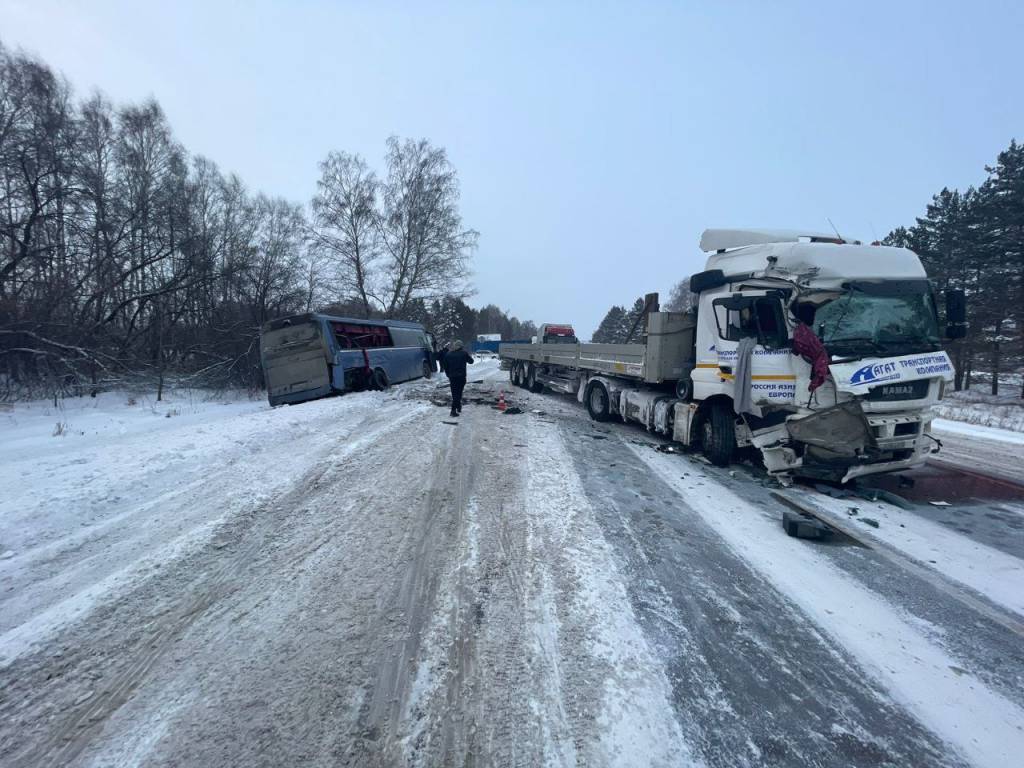 ДТП произошло в районе половины одиннадцатого утра на 83 километре автодороги Р-256 «Чуйский тракт». Автобус KIA Grandbird, который двигался в сторону Барнаула, неожиданно выехал на встречную полосу и врезался в грузовик КАМАЗ.