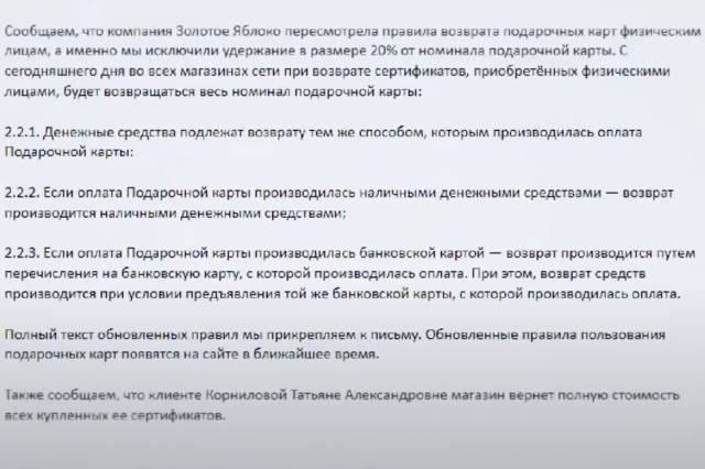 Возможно, осознав шаткость своей позиции, в «Золотом яблоке» все же поспешили пересмотреть собственные правила. 30 марта 2023 года в адрес редакции «Прецедента» пришло письмо, в котором компания сообщила, что отныне гарантирует клиентам получение всей суммы сертификата при возврате.