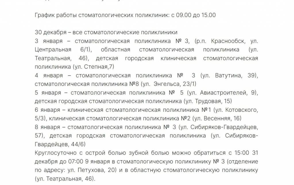 Ниже приведем список стоматологических отделений, которые будут функционировать в Новосибирской области в новогодние праздники: