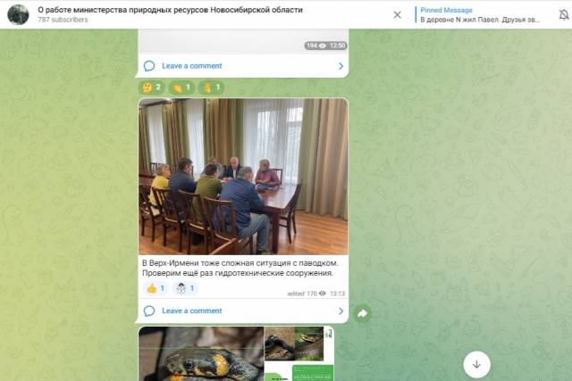 Сначала канал переименовали в “Министерство природных ресурсов и экологии Новосибирской области”, правда на аватарке все также красовался портрет министра. Затем тг-канал получил новое название “О работе Министерства природных ресурсов и экологии Новосибирской области”, поменялась и аватарка — теперь там красуются мишки, изображенные по мотивам нетленного произведения «Утро в сосновом бору» русских живописцев Ивана Шишкина и Константина Савицкого.