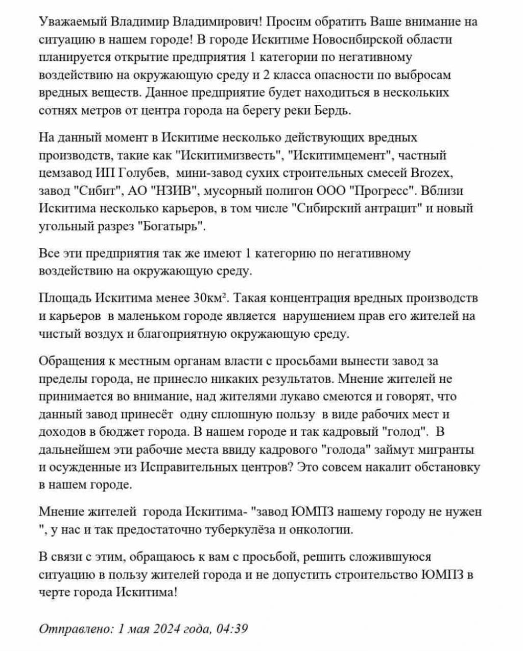 Помимо петиции, сибиряки отправили обращение к Президенту РФ Владимиру Путину. Возмущенные жители указали, что на их маленький городок приходится сразу несколько вредных производств, поэтому открытие еще одного завода им не нужно.