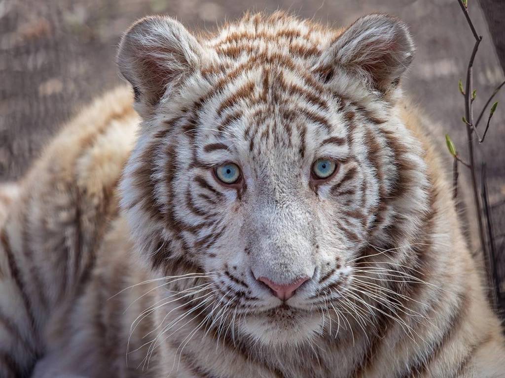 Кови – детеныш бенгальских тигров. У него голубые глаза и светлая шерсть с темными полосками. Окрас не такой контрастный, как у взрослых тигров, он изменится со временем.
