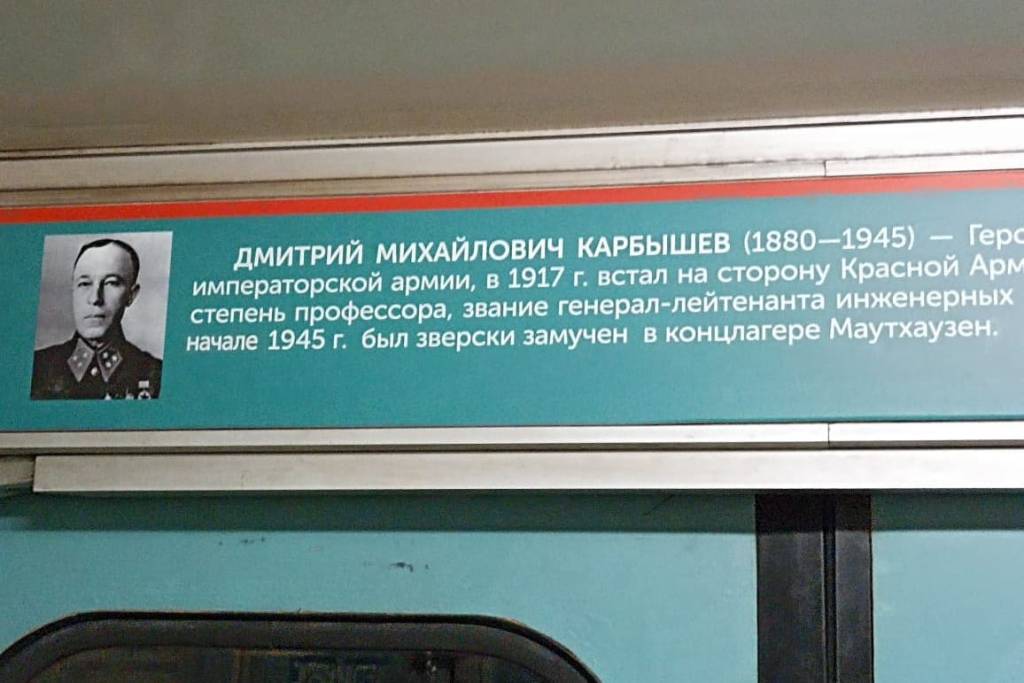 Согласно размещенной в метро информации, Карбышев был замучен в концлагере Маутхаузен в конце 1945 года. Однако это не соответствует действительности – Дмитрий Михайлович погиб значительно раньше – в ночь на 18 февраля 1945 года.