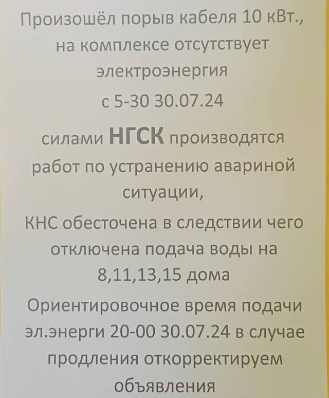 — Произошёл порыв кабеля, на комплексе отсутствует электроэнергия. Силами НГСК проводятся работы по устранению аварийной ситуации. КНС обесточена, вследствие чего отключена подача воды. Ориентировочное время подачи электроэнергии – 20:00 30 июля, — говорится в объявлении.