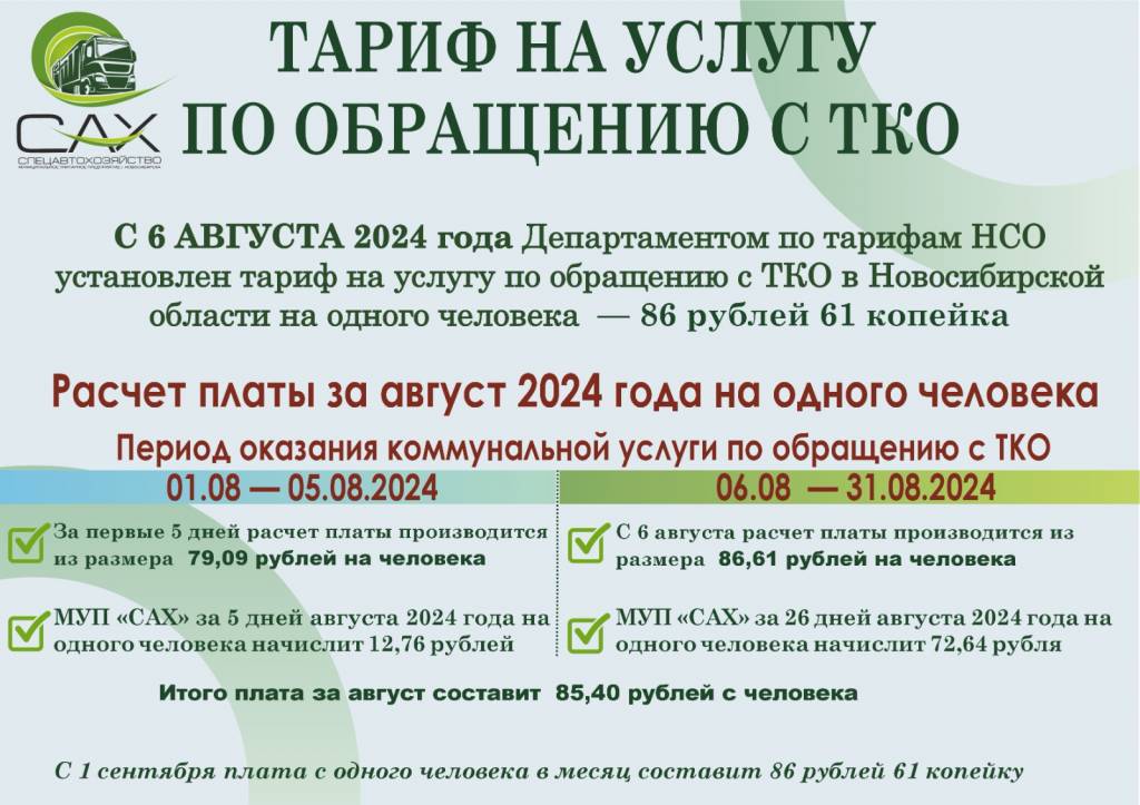 — С учетом установленного норматива накопления твердых коммунальных отходов, размер платы за коммунальную услугу по обращению с отходами за одного человека составит 86,61 рублей в месяц. С 1 по 5 августа размер платы за услугу по обращению с твердыми коммунальными отходами составит 12.76 рублей, с 6 по 31 августа — 72,64 рублей с человека. Итого за август 2024 года размер платы за услугу по обращению с ТКО составит 85 рублей 40 копеек, начиная с 1 сентября 2024 г — 86,61 рублей с человека, — объяснили в МУП «САХ».