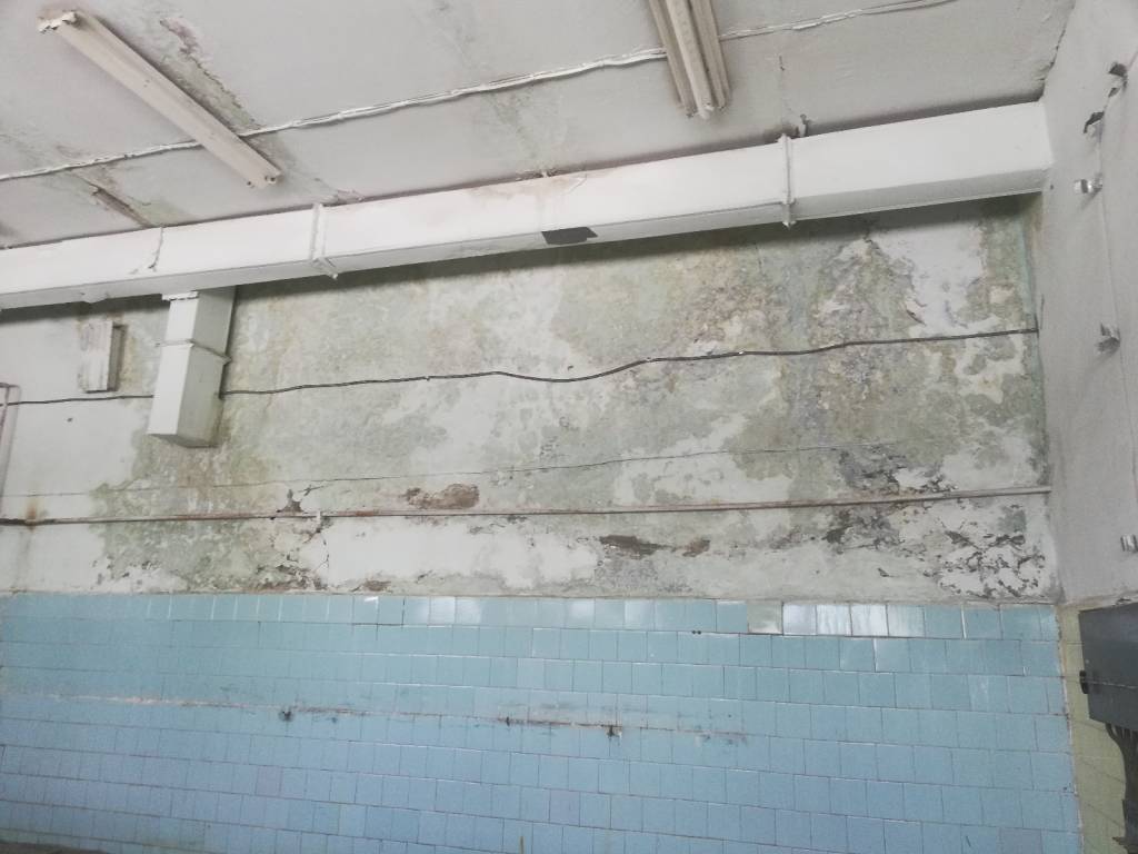 — Это раздевалка на 38 посадочных мест, здесь у нас помывочное отделение. Вот обратите внимание на тот же самый потолок, видны сразу оголения металлических стальных конструкций на железобетонных перекрытиях, поэтому все это требует капитального ремонта.